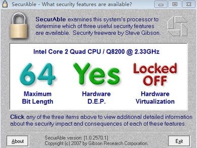 1.由于有可能您的系统的BIOS可能会故意禁用对硬件虚拟化的支持(有些做),如果可能,您应该在32位版本的NT,XP或Vista下使用管理权限重新运行此程序。 这将允许SecurAble运行一些内核模式代码,以确定究竟发生了什么。2.您还可以在系统的BIOS中查找是否能找到任何对“硬件虚拟化”或“VMX”的引用。