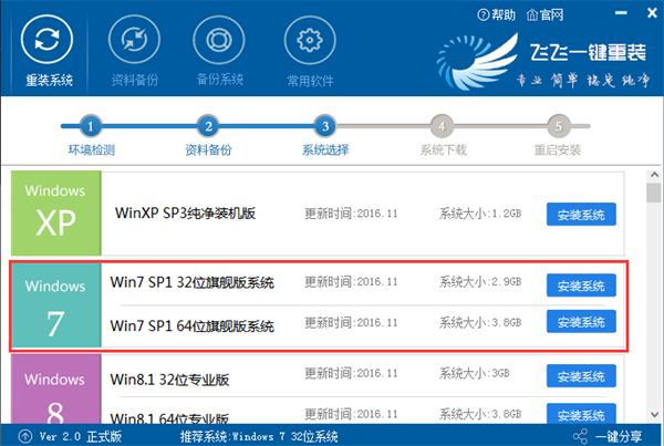3、到达系统选择界面,飞飞一键重装精选了好用的操作系统,选择自己需要安装的操作系统版本、位数,点【安装系统】;