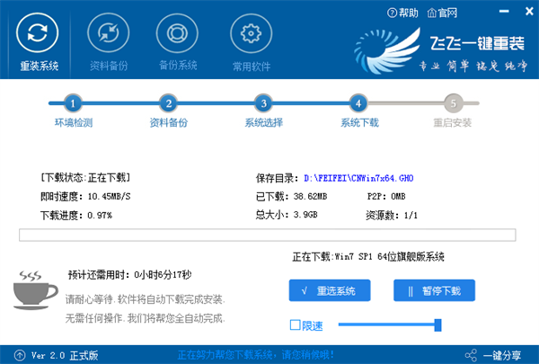 4、下载系统、飞飞一键重装使用P2P加速,下载几分钟到十几分钟就可完成!(视你的宽带大小)