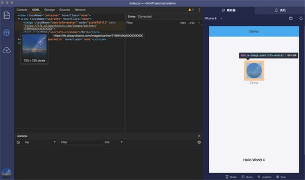 小程序开发者工具也提供了定制的 Devtool,用于查看模拟器运行的日志等。我们也提供了 AXML 插件用于调试小程序的元素。
