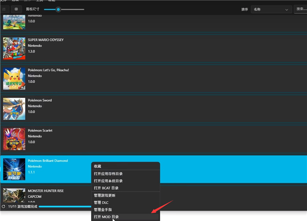 2、然后我们随便找到一个游戏,这里以宝可梦钻石为例子,右键点击宝可梦钻石选择打开MOD目录;