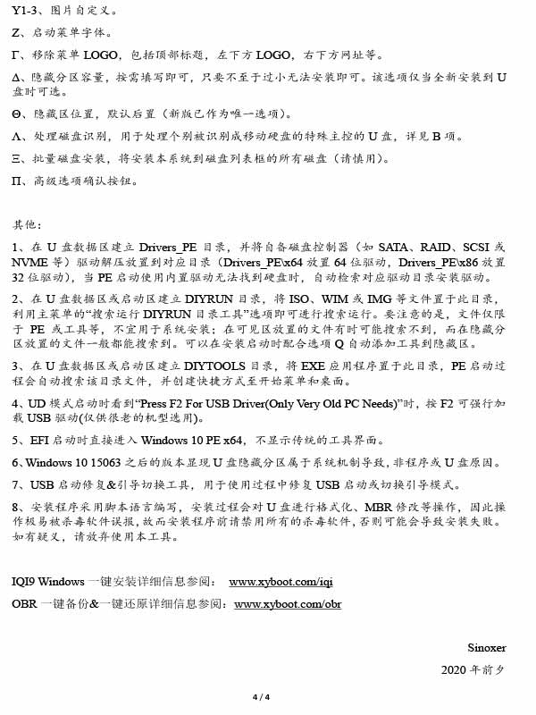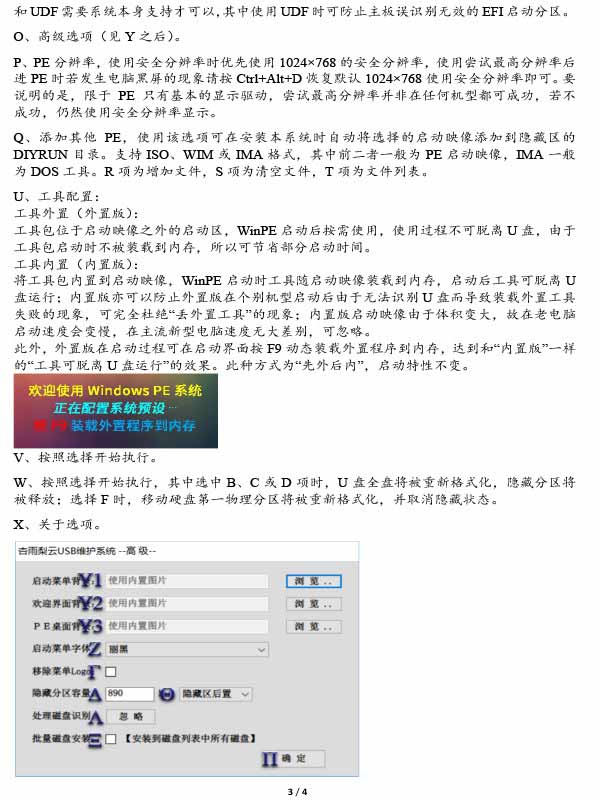 PS:以庚子版说明为例 A、磁盘信息列表 B、全新安装到U盘,格式化全盘并创建隐藏分区,全盘内容将被清空。(非特殊需要,一律推荐使用该选项进行安装,首次安装到U盘必须使用本选项)。 注:某些特殊主控的U盘属性为 FIXED而非常规的REMOⅵABLE,此美U盘在计算中会显示为“硬盘”,在本工具亦会识别成移动硬盘。此时,只要点击高级选项的Δ项,即可处理识别,重新识别成U盘进行安装:此外,此类U盘亦可以当“移动硬盘”,用选项F安装。 C、升级安装到U盘,格式化由本工具创建的隐藏分区,仅限首次安装后(已经向U盘安装过本系统后)再次安装时使用。其中M项的引导模式部分可互相升级,UD和非UD模式不可互转。若使用该项安装后无法启动,往往是分区损坏、模式不正确、空间不足等原因引起,请选择B项进行全新安装。 D、安裝到U盘存储区,使用此选项不创建隐藏分区,直接将本系统安装到U盘存储区,要主意的是,U盘如果米用了非标准的分区结构或含有其他未知分区,则必须同时勾选E项格式化才可正常安装。 F、安装到移动硬盘第一分区,仅在插入并选择移动硬盘时可用,无移动硬盘时该项为灰色不可用状态。此项将安装本系统到移动硬盘的第一物理分区,安装时移动硬盘的第一物理分区将被格式化并隐藏(某些情况下可能要重新拔插移动硬盘或重启计算机后生效)。要注意的是移动硬盘必须是MBR分区表,总体积不能超过2T。第一物理分区体积建议不要超过30G。 否则FHI引导等部分功能将受限;有些移动硬盘由于分区不规范而无法安装的,请勾选G项安装时对移动硬盘进行重新分区,此时移动硬盘全盘数据将被清空。分区按照第一分区4G,剩余为第二分区的規则进行。 H、安装到本地磁盘,当安装到基于BIoS的系统时,启动效果和安装到U盘完全一样;当安装到基于EFI的系统时,由于其他BIoS模块不能在基于EFI的模式下运行,启动时直接进入 Windows10PEx64。安装到本地磁盘盘符从I项选择即可。 J、生成IsO镜像,将本系统生成IsO镜像,生成镜像可用于光盘刻录或者 UltraISo、 Rufus写入到U盘。 用 UltraIso将生成的ISO镜像写入U盘攴持以下模式组合: 用 Rufus将生成的IsO镜像写入U盘建议使用: K、Iso镜像格式,UDF模式对新设备兼容较奷,ISO内部还攴持超过4G的大文件。无特殊需要一般建议选择该项即可,ISO9660仅供需要者选用。 L、EHI模式确认后启动,当制作的Iso镜像以EFI模式启动时,按任意键确认后启动,否则跳过;反之,EFI模式无提示启动不需要按任意键确认而直接启动。 M1、引导模式: USB-HDD( WinNT6),兼容性最好,但启动性不一定最强 USB-HDD(HDD+),兼容性和启动性兼顾 USB-HDD(G4D),对上两模式的补充 USB-HDD(UD),对老电脑启动性较强,但兼容性稍差 USB-ZI(UD),仅供很古老的电脑备选。 M2、wBM简约文字: Windows Boot Manager样式简约文字莱单(出错率更低); G4D经典图形:Grub4dos传统经典图形莱单 N、存储区格式: NTFS/FAT32 ExFAT/UDF,仅当全新安装到U盘时该项选择才有效。而ExFAT和UDF需要系统本身支持才可以,其中使用UDF时可防止主板误识别无效的EF启动分区。 O、高级选项(见Y之后)。 P、PE分辨率,使用安全分辨率时优先使用1024×768的安全分辨率,使用尝试最高分辨率后进PE时若发生电脑黑屏的现象请按Ctl+AltD恢复默认1024×768使用安全分辨率即可。要明的是,限于PE只有基本的显示驱动,尝试最高分辨率并非在任何机型都可成功,若不功,仍然使用安全分辨率显示。 Q、添加其他PE,使用该选項可在安装本系统时自动将选择的启动映像添加到隐藏区的DⅣYRUN目录。支持ISO、WIM或IMA格式,其中前二者一般为PE启动映像,MA一般为DoS工具。R项为增加文件,S项为清空文件,T项为文件列表。