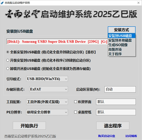 杏雨梨云启动维护系统这是一款系统维护工具,这款工具使用起来非常的简单,界面对于新手小白来说也是非常简洁友好的。而本站带来的杏雨梨云u盘启动精简win10专版,它能够给用户提供安装到USB磁盘、安装到本地磁盘和生成iOS镜像三种安装方式,能够基本满足用户需求。你还能够通过选项来选择是安装全新的系统或是升级并进行安装和卸载并进行还原。除了这些之外这款全新的版本能够运行windows 10 PE x64维护系统BIos、运行windows 10 PE x86维护系统BIOS、运行1QI x快速装机中心x64 BIOS、运行二级工具菜单、运行DiskGenius分区管理、运行windows内存诊断、运行windows密码清除、搜索运行DIYRUN目录工具、硬盘启动计算机和关闭计算机电源等选项功能!杏雨梨云USB启动维护系统2020端午版有个人开发的第十代 IQI X Windows 一键安装系统工具,还有OBR 一键备份&一键还原和IQI一键分区等人性化功能。并且支持多种制作类型、引导模式、存储区格式、PE分辨率、工具配置以及高级设置。
