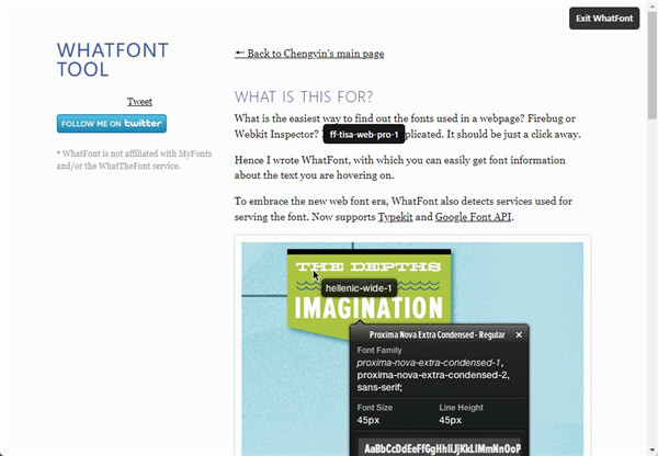 whatfont是应用在Chrome浏览器的一个网页字体识别插件,安装它之后你可以快速的查看网页当中的字体。作为一个网页设计人员,许多时候都需要参考他人的优秀设计,在研究网页使用字体的时候比较麻烦,往往需要借助工具,或者查看CSS,由于网页中不止一种字体,所以这个操作会花费比较多的操作和精力。不过有了WhatFont,这一切都变得容易起来,只要简单一点即可显示字体详细信息。