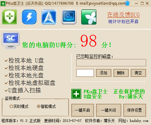 PKu盘卫士是一款方便易用的本地磁盘工具。我们都知道U盘中的文件有可能会携带病毒,而这款软件支持监视本地硬盘,监视本地光盘,监视本地虚拟磁盘,当你的电脑识别出u盘威胁后就会弹出提示,让你的电脑变得更加安全!