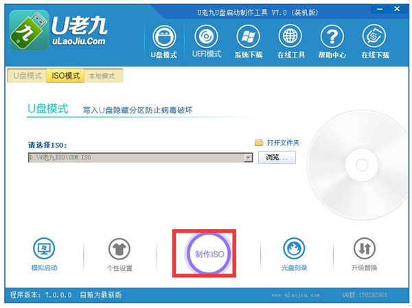 1、从下载老九到制作U盘启动盘,只需简单的几步即可完成。制作过程只需一键即可,所谓轻松一键,启动U盘实现 2、ISO有引导镜像制作、ISO镜像写入U盘以及ISO镜像刻录到光盘功能 3、“本地模式”功能,可将老九直接安装到本地系统盘,启动方式可选择性(系统菜单和热键启动两种模式)支持一键安装以及一键卸载,还可以任意设置启动密码 4、PE工具栏 - ”我的工具“文件夹,方便用户下载常用的PE维护工具存放到该文件夹,U盘启动制作完毕后将自动在U盘新建“我的工具”文件夹,方便用户存放下载的PE工具 5、老九内置”Win2003PE系统“和”Win8PE系统“,2003PE系统工具齐全,操作简单稳定;win8PE系统启动迅速,界面新颖 6、驻U盘启动制作工具,只要是老九制作的启动U盘,就可以脱离主程序驻U盘安装本地模式和克隆U盘 7、制作启动U盘后自动创建GHO目录和我的工具目录功能 8、ISO模式制作u盘启动可支持UEFI启动功能软件特点