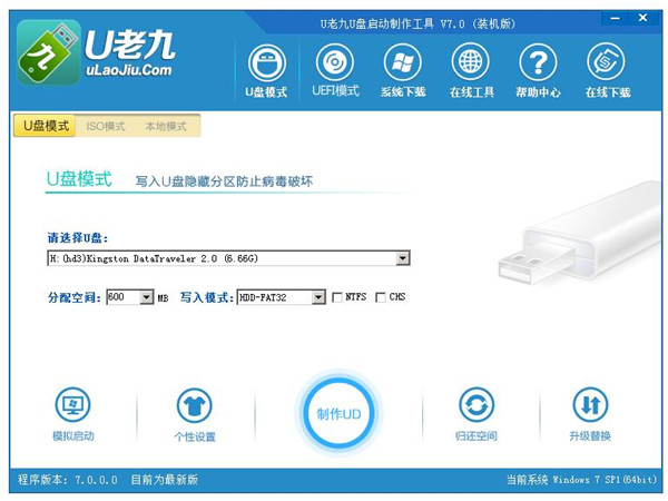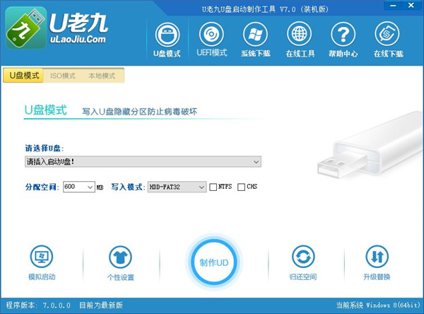 u老九u盘启动盘制作工具是一款功能强大、操作简单、实用性强的免费的U盘装机工具软件。u老九u盘启动盘制作工具采用傻瓜式操作,只需一键即可快速制作出启动u盘,操作简单方便,真正意义上实现一盘两用的功能,制作好的启动u盘不仅能引导电脑启动,同时还能当作普通u盘进行日常文件数据存储。u老九u盘启动盘制作工具使用简约而又创新的界面风格,保证在制作过程当中不添加任何插件广告以及系统文件篡改。经技术人员不同的系统安装测试,任何系统经由u老九u盘启动盘可成功安装至我们的电脑当中。目前u老九u盘启动盘制作工具不需要任何技术基础,一键制作,自动完成制作,平时当u盘使用,需要的时候就是修复盘,完全不需要光驱和光盘,携带方便。u老九u盘装系统工具最大更新特点增加支持uEFI启动功能。是不是心动了,有需要的朋友下载看看。