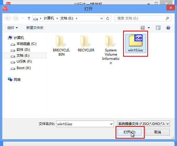 5、在弹出的选择文件对话框里,选择已经下载准备好的原版Win10系统镜像,之后我们点击 “打开” 按钮选择原版Win10系统镜像,如下图所示: