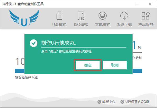 4、制作成功后会弹出一个窗口,告知用户 “制作U行侠成功”,此时点击 “确定” 按钮,可以测试U盘启动的启动情况,如下图所示: