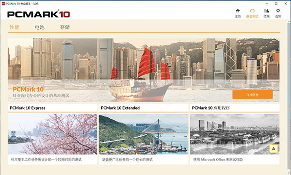 PCMark10是国外大名鼎鼎的Futuremark公司开发的一款专家级权威电脑整机性能全面基准测试软件,现在我们大多数人刚买到新电脑基本就会使用鲁大师测试一下,看看硬件性能什么的,但是鲁大师的和测试方式得到的数据非常的不可靠,而且测试结果可以篡改,跑跑也就行了,想要了解电脑的真实性能还是用PCMark,PCMark可以使用基于实际应用和活动的测试来衡量PC的性能,包括浏览网站、视频会议、编写电子表格、编辑照片和视频、玩游戏等日常任务,并给出一个整体评价分数。为了满足日新月异的计算机硬件测试需求,完全体现出新一代硬件的性能水准,Futuremark又为我们带来了最新版本的PCMark10,支持中文。PCMark10拥有一整套性能测试流程,覆盖了当代PC环境的各种不同应用任务,既有此前版本测试的改进版,也有全新加入的,并提供高层、中层、底层三种不同测试成绩,UI界面也进行了重造。另外,PCMark系列一贯过于耗时的问题也得到了根治,PCMark 10简化了测试方式,无需再像PCMark8那样区分传统和加速测试,一键即可开始测试,PCMark10完整测试所需时间不到之前版本的一半。PCMark10测试可选三种方式:主要基准测试:通过广泛的测试项目,从常用基本功能、生产力相关应用程序,到较繁重的数码媒体工作内容,测量性能。Express精简测试:一个较短的基准测试,专注于基本的家用电脑使用,包括常用基本功能和生产力测试组合。Extended扩展测试:扩展了主要的基准评测,通过苛刻的游戏测试测量GPU和CPU性能,全面反映PC性能表现。