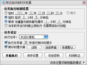 阿达自动定时关机器是一款小巧实用的定时关机工具。软件功能包括关机、锁定、注销、锁定计算机、关闭显示器、断开网络、计算机待机休眠等多种方式,设定时间精确到秒,另外还有一些高级选项,例如禁止用户使用某些程序,禁用任务管理器,禁止浏览色情网站等,对着管理电脑非常有帮助,可以防止小孩浏览不良网站等,阿达自动定时关机器界面简洁,符合用户操作习惯,一键设定,方便快捷。