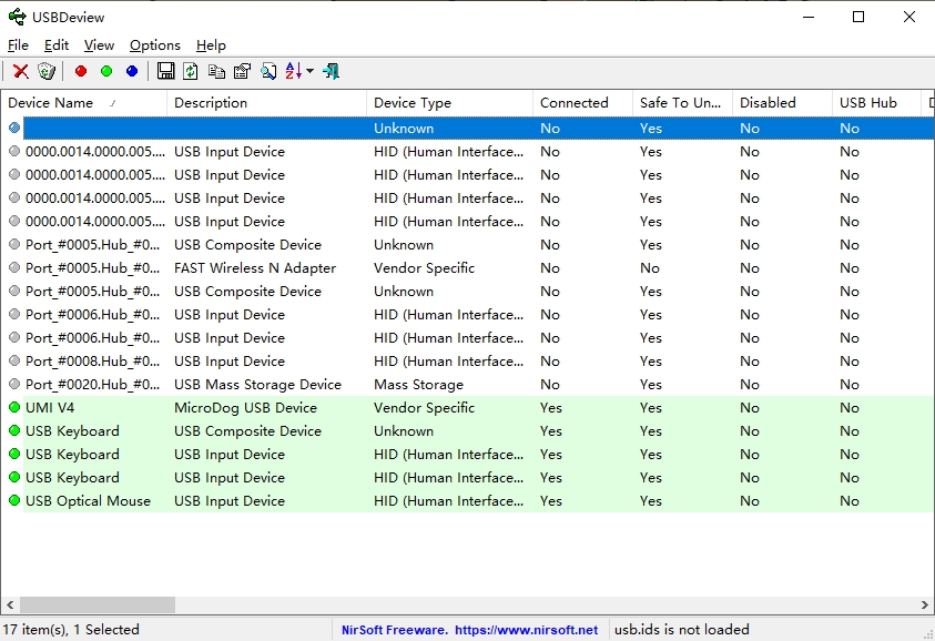 USBDeview官方版是一款用于管理/监测USB设备的实用工具,它可以列出当前连接到你的计算机上或者曾经连接到你的计算机上的所有USB设备,并根据列出的设备的名称和描述进行显示串口号、设备添加的日期、最后连接的日期、VendorID以及其它信息!当然,你也可以通过USBDeview断开或者卸载列表当中的任何设备,以及导出该列表为Text/HTML或者 XML格式的信息文件。有需要的用户欢迎下载使用。