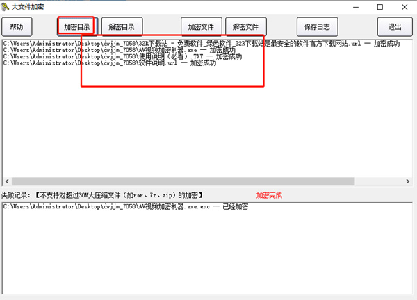 3、目录加密:将对选择的目录及其子目录中的所有文件进行加密,不支持对超过30M的已压缩文件(如rar、7Z、zip文件)进行加密