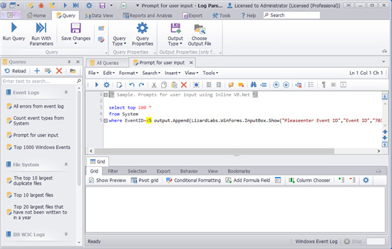 SQL查询可以解释为一种特殊的搜索操作类型,它不仅功能强大,而且具有更多可能的自定义选项。通常,这些查询只能在数据库上执行,因为它们包含其他文件格式无法识别的特殊术语,但是Log Parser Lizard凭借其自身的SQL语法,使您可以对纯文本文件运行SQL查询。