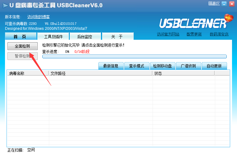 1、病毒侦测包括全面检测,广谱检测以及移动盘检测,全面检测可精确查杀已知的U盘病毒,并对这些U盘病毒对系统的破坏作出修复,广谱检测可快速检测未知的U盘病毒,并向用户发出警报,移动盘检测,检测U盘,MP3等移动设备的专门模块,要独立使用。