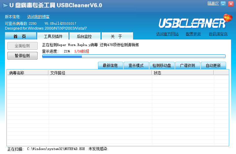 2、独创的杀毒引擎:USBCleaner使用原创的分类病毒查杀引擎,带毒杀毒,闪电查杀