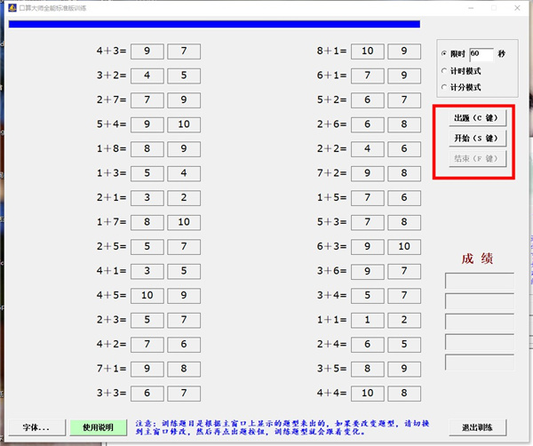 提示:为了方便,做题时请使用快捷键:开始做题:S 键,结束做题:F 键,出题:C 键