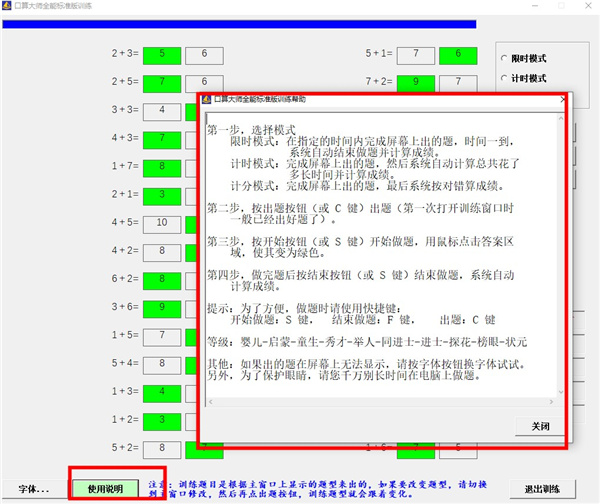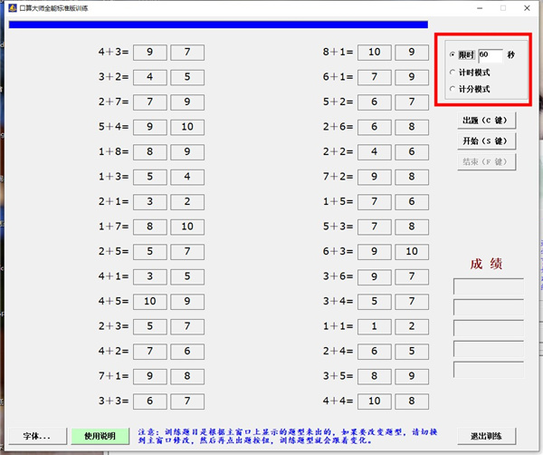 计时模式:完成屏幕上出的题,然后系统自动计算总共花了多长时间并计算成绩。