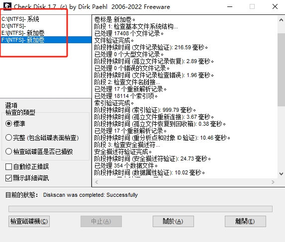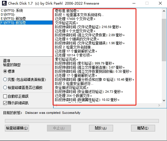 CheckDisk是一款强大的硬盘坏道修复工具。它是一个命令行版chkdsk.exe 的图形界面版,使用它能够轻松的检查出物理错误或坏扇区的磁盘表面上。原来的英文已经被大神汉化了,没有语言的障碍,使得使用起来更加的轻松,他有着三种模式,分别是“标准”“完整”“检查磁盘区是否已损毁”。使用这些能够自动的将错误处检测出来,然后进行自动的修正。如果有需要可以下载使用!