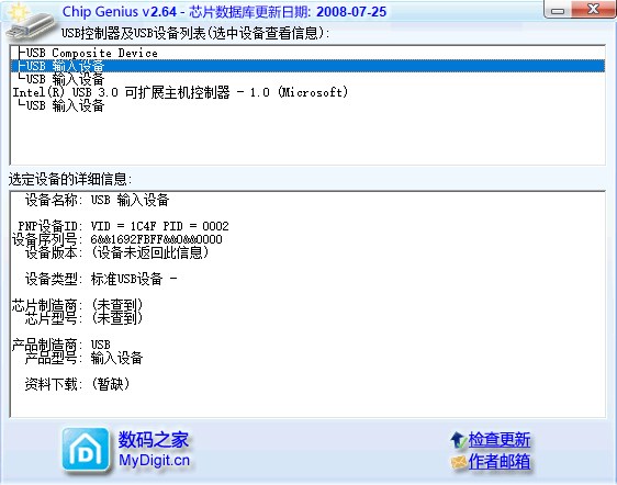 4、提供USB控制器及USB设备列表(选中设备查看信息),芯片数据都可以在软件查看