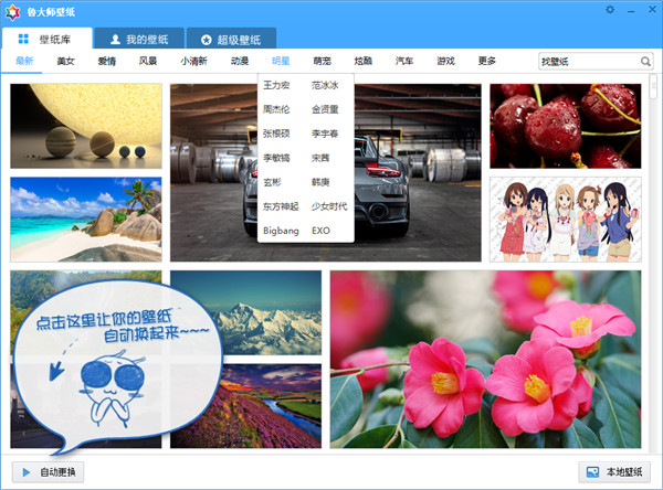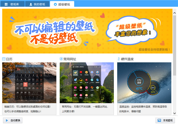 1、海量电脑主题和桌面壁纸随意您选择和使用。 2、完全免费的一款绿色桌面壁纸软件。 3、能够满足您各种类型的壁纸的安装和使用。软件亮点