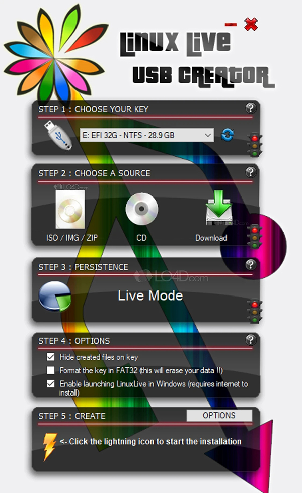 LinuxLive USB Creator官方版是一款功能强大的用于在windows里创建一个可启动Linux的usb的程序,该软件不需要任何配置或安装Linux操作系统就可以直接在windows里直接运行Linux系统,快速创建可引导U盘的软件。LinuxLive USB Creator有着漂亮的界面,你可以快速创建一个可启动的U盘,通过特制版本的虚拟机可实现直接在Windows下启动Linux,无须安装也不需要设置。支持大多数Linux发行版,如:Ubuntu, Fedora, Debian, Damn Small Linux, Puppy Linux等等。有需要的朋友千万不要错过哦!