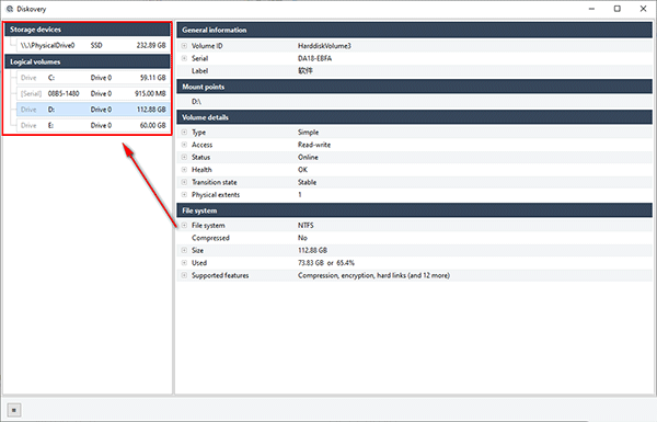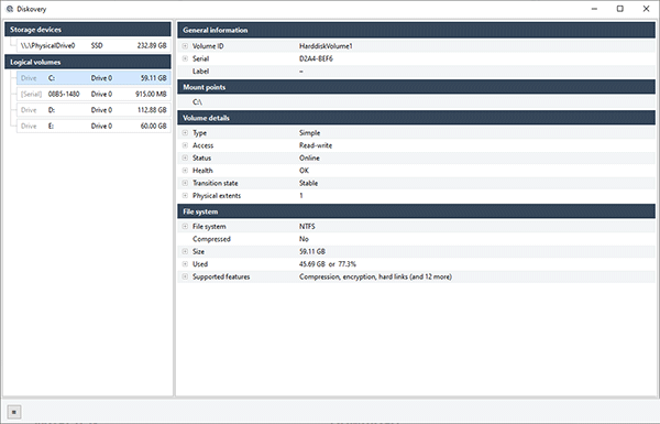 Diskovery是一款小巧且实用的硬盘储存数据检查软件,只需几步就可以快速的将你想要的硬盘储存一切信息查看到。收集并显示计算机数据存储设施的详细信息,Diskovery可以检测包括其物理驱动器,磁盘阵列,分区,卷和挂载点。操作简单快捷。而且还配置了管理器请求Disk和StoragePort 类中的所有设备来开始其扫描,快速收集设备数据存储的详细状况,软件占用空间极小,非常便捷。Diskovery界面简洁清晰。动态卷拥有精确的类型-跨越,条纹,镜像等。磁盘分区类型-MBR,GPT等。