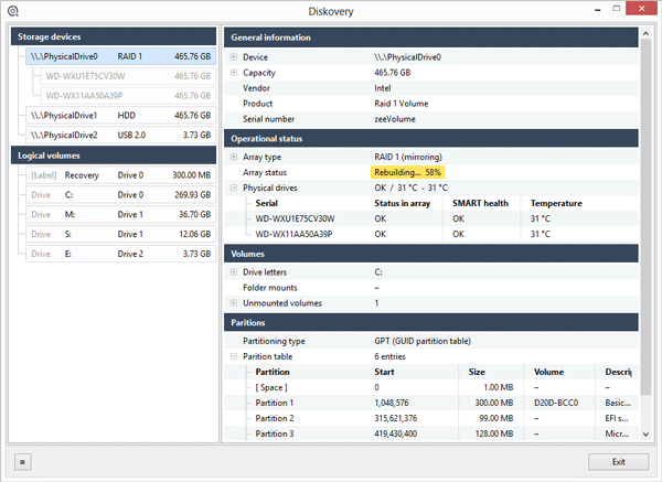 类型-RAID 0/1/5包括其物理驱动器、磁盘阵列、分区、卷装入点。