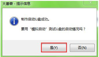 4、u盘启动盘制作完成后,会弹出一个大番薯信息提示窗口:“制作启动u盘成功,要用模拟启动测试u盘启动情况吗?”我们点击“是”测试制作完的u盘启动盘是否可用。