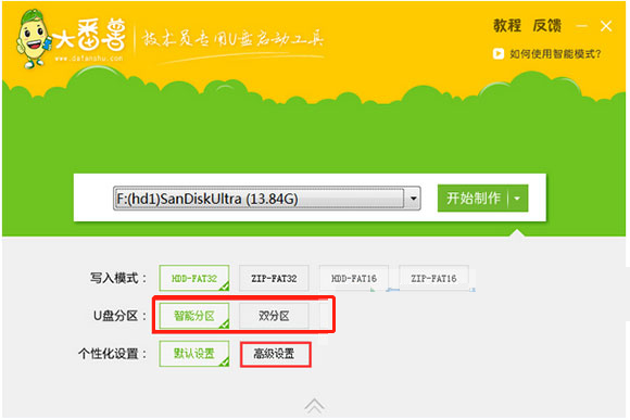 一、u盘启动盘准备工作 1、下载本站提供的大番薯u盘装系统软件; 2、容量大于4G并且能够正常使用的u盘一个。 二、具体步骤 1、双击打开大番薯u盘启动盘制作工具,在左下方窗口选择“智能模式”,然后将准备好的u盘插入电脑的usb接口,大番薯会自动识别u盘,点击“开始制作”旁下拉菜单,选择“u盘分区”栏相关进行制作的模式,若想个性化设置的朋友可点击“高级设置”,个性化设置过程可参考:”大番薯u盘启动个性化设置教程“,如图所示: