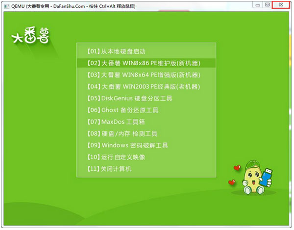 5、若看到u盘启动盘在模拟环境下的正常启动界面,说明u盘启动盘制作成功(注意:模拟启动界面仅供测试使用,请勿进一步操作),最后按组合键“Ctrl+Alt”释放出鼠标,点击右上角的关闭图标退出模拟界面,如图所示: