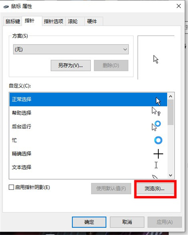 3、在弹出的属性框中选择第二个指针设置,选择右下角的浏览。
