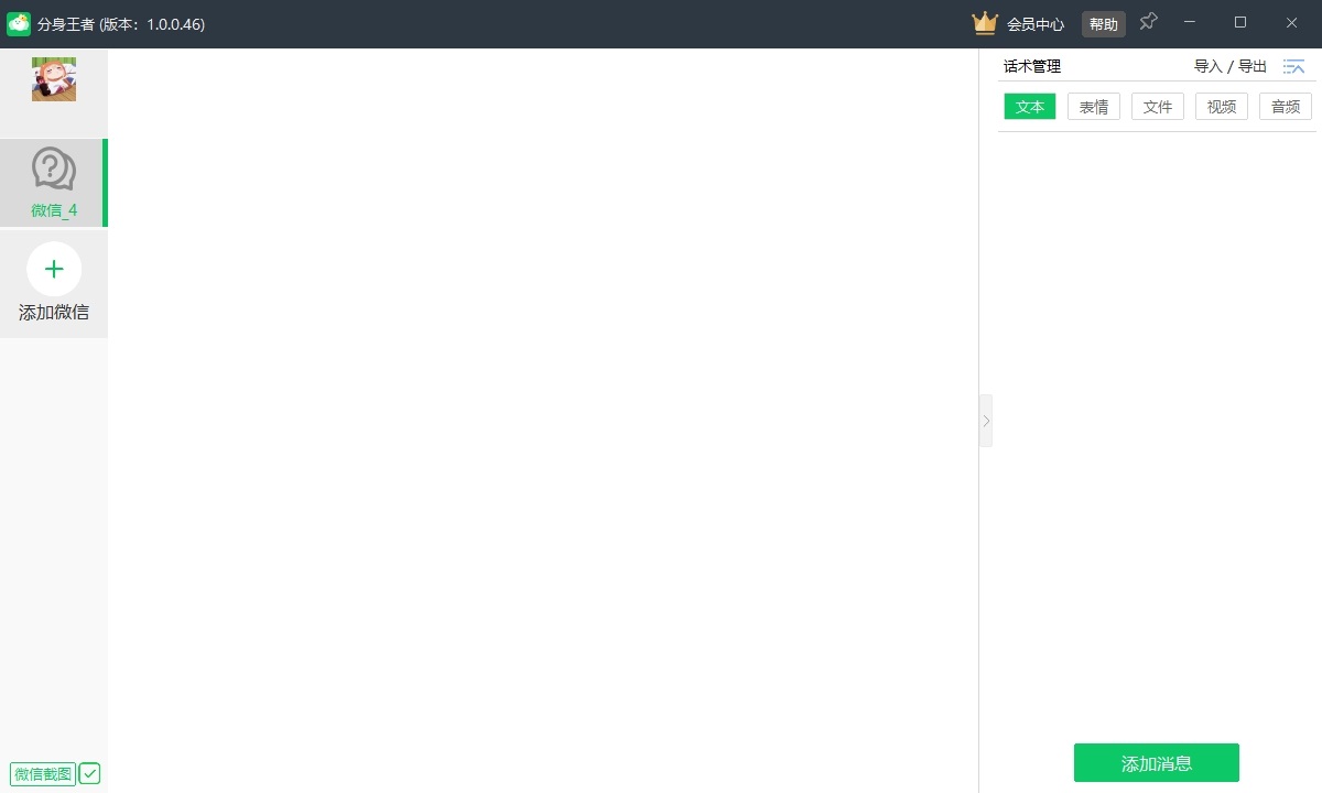 分身王者电脑版是一款微信多开/微信双开电脑PC版多开工具,它支持同时双开或多个微信账号,并且在多开的同时它还拥有微信的辅助功能,如截图、自动登录账号、打字时按esc键取消打字等等!此外,分身王者还有着可提升客服人员沟通效率的话术管理功能,其功能可让你减少重复打字,从而更高效的完成沟通工作!