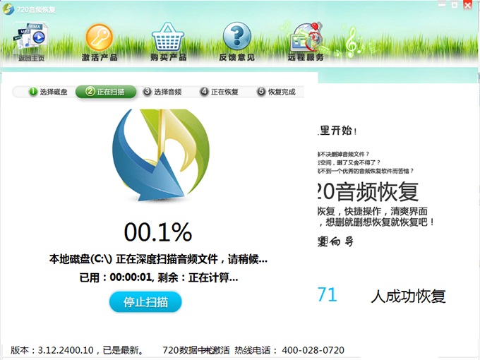 720音频恢复软件是一款专业的音频恢复软件,我们生活中许多人都会听音乐,音乐是世界上最奇妙的声音,带我们进入不一样的世界,带我们美好的享受,但是突然有一天不小心删除了音乐怎么办?720音频恢复软件帮您找回过往的美妙经历,软件能够扫描恢复由于各种原因造成音频丢失破坏的各种音频文件,能够最大程度上帮您恢复。720音频软件保留常规数据恢复产品的优势,并加入针对常用音频文件的存储格式以及对音频类专项格式的分析恢复,极大的提高了对音频文件恢复的能力。720音频恢复软件采用最先进的音频识别扫描引擎,帮助用户快速高效的恢复音频文件,软件界面设计美观友好,向导式操作界面设计,只需按照一步一步步骤就能快速的恢复文件,欢迎有需要的下载体验!