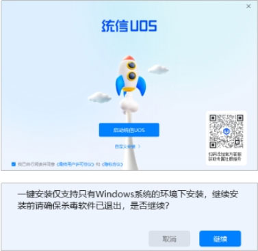2、单击 【启动统信UOS】。确认电脑是否只安装了Windows,无其他操作系统,确认无误单击【继续】。