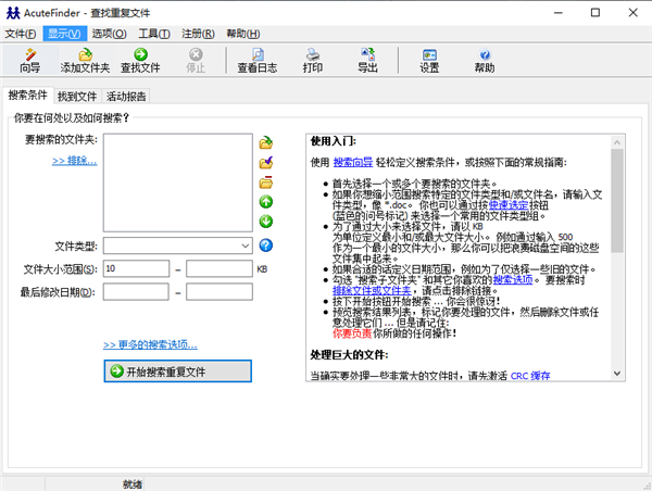 1、简单,方便操作的界面 2、搜索向导能轻松开始你的搜索操作 3、每次搜索可以指定很多根目录或驱动器 4、快速搜寻,尤其是在处理巨大的文件时 5、使用 CRC32 和 MD5 校验来安全的比较 6、能选择缓存文件的 CRC 值来方便以后重复扫描的快速搜索 7、能选择在搜索时忽略文件大小和 CRC 8、能选择在 ZIP 存档文件中搜索 9、能通过后缀说明来指定多个文件类型 10、快速选定常用文件类型组,像文档和音乐 11、默认情况下,至少有一个重复文件将保留,即使你在每组中选择了删除所有文件 12、能选择保护在指定的搜索文件夹中的文件被删除 13、支持所有的驱动器类型: 硬盘,网络,网络文件夹,软盘,USB,NAS,JAZ,ZIP,CD/DVD 和存储盘 14、详细显示,能颜色区分找到文件的列表,如果是大的显示器可以全部选定显示 15、轻松的选择文件,可以使用复选框,弹出菜单和键盘快捷方式 16、在找到文件的列表上有很多操作 17、内建的文件查看器能自动查看图片和文本文件 18、你可以以不同方式来排序文件列表 19、同过浏览器来打印网页格式的列表 20、导出列表到有分隔符的文本中,网页,XML 文档或者创建 bat 文件 22、能选择活动日志保存到一个文本文件中 21、提供了许多设置,以适合你的风格 22、有查找空白文件和空文件夹的工具并能删除它们 23、有计算或验证任何文件的校验值 24、详细的帮助文件,有关键字索引,加上在线帮助 25、可打印的全彩色用户手册,超过60页 26、所有注册用户免费终生电子邮件支持AcuteFinder中文版注册码使用