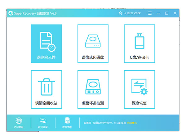 1、打开super recovery数据恢复软件可以看到软件总共有6种选项可以进行选择,我们常常要恢复的文件资料都是因为我们误删造成的,所以这里我们选择误删文件的选项。