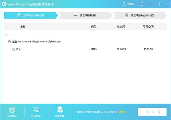 2、选择后来到下图的界面,在这里显示的是电脑中的分区,如果要进行文件的恢复,就必须要找到文件之前所在的分区,也就是它在哪个存盘,选择分区后点击下一步。