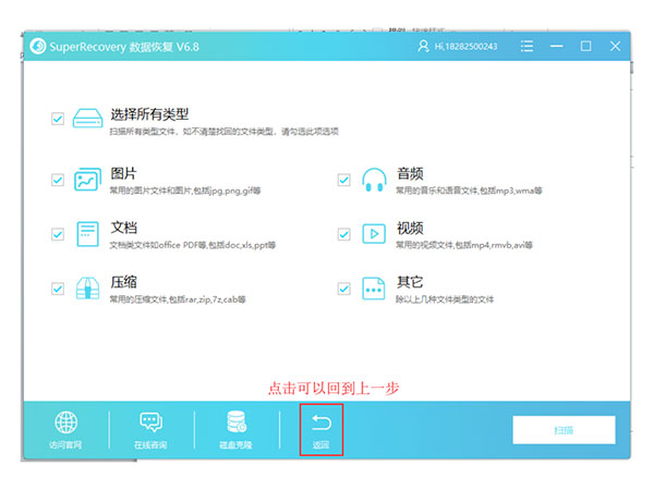 3、在这里就可以看到我们所有的文件类型了,总共有6中选项进行文件的恢复,大家一定要记得选择相应的选项进行文件的恢复,不然扫描所耗费的时间是很长的。