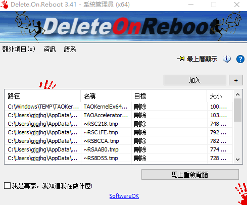 Delete On Reboot是一个小型且有效的免费软件程序,它涉及在Windows计算机重新启动时以优雅的方式删除不可擦除的文件,目录,子文件夹。您不需要安装Delete.On.Reboot工具,只需将Delete.On.Reboot放在桌面上,然后将文件拖放到Delete.On.Reboot.exe上,这样就可以进行工作/删除。它可以在Windows下用作便携式应用程序。