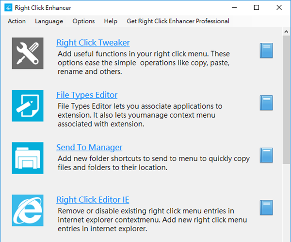 Right Click Enhancer是一款非常出色的右键菜单增强工具,它可以帮助用户集成到右键菜单快捷启动的一个小程序中,包括集成很多功能在右键菜单,只需在工具种勾选想要在右键菜单集成的工具,即可使用,比如实践文件加密/解密功能、复制内容即不打开文本文件、计算哈希值以及创建文件列表、上帝模式等诸多实用右键功能等等,还可添加或删除右键菜单,支持IE右键,桌面右键文件夹、文件类型右键菜单编辑、发送到菜单、新建菜单等。因此,用户利用Right Click Enhancer便可达到很多常用的操作都可以通过鼠标右键来完成,大大提高你的工作效率!