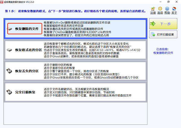 1、运行超级硬盘数据恢复软,选择需要的数据恢复模式,点击下一步进行恢复