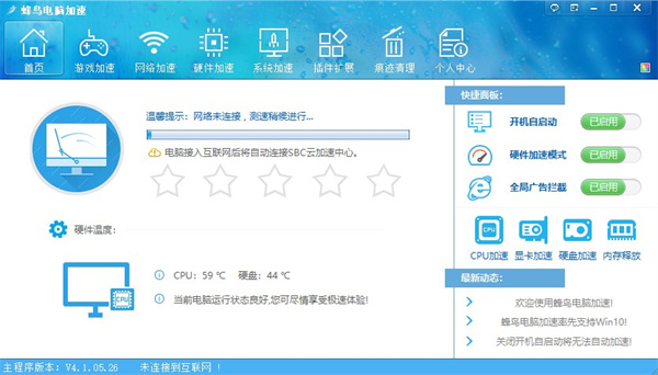 蜂鸟电脑加速官方版是一款全方位的电脑加速软件,具有系统加速、硬件加速、网络加速、游戏加速、广告拦截等多种功能,急速体验,优化加速您的爱机!蜂鸟电脑加速还可以自动调节内存,CPU,硬盘等硬件的性能,可以自动控制温度,让您的电脑保持良好的运行状态,也支持广告拦截功能,避免第三方附加的广告在电脑上启动,功能十分丰富。