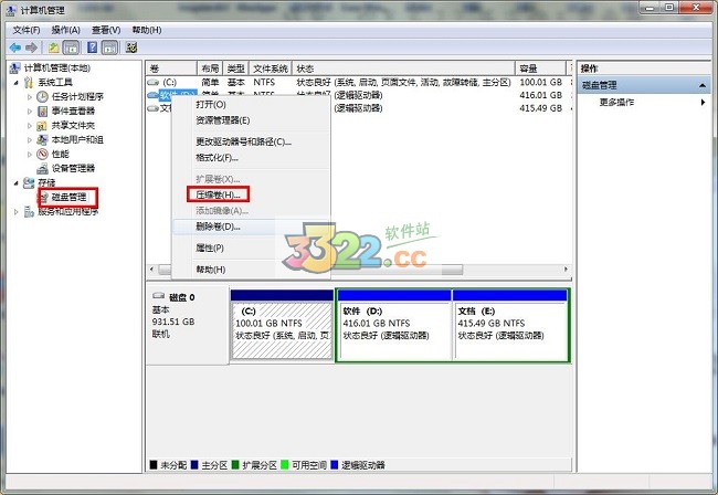 3、接下来,选择你需要分割的盘。点击鼠标右键,选择压缩卷。(这一步是为了腾出可分割空间用的)