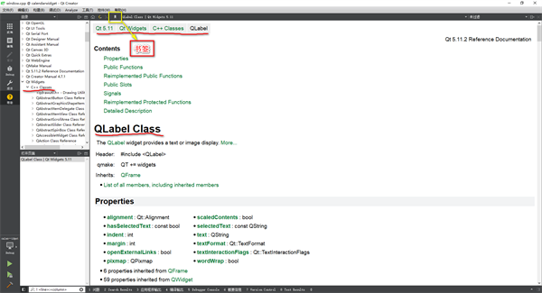 按下 Ctrl + 6 组合键(或者单击“帮助”图标)进入帮助模式,如下图所示。例如,想查看 QLabel 的相关说明,则进入Qt Widgets -> C++ Classes -> QLabel 页面查看。在查看帮助时,可能想为某一页面添加书签,以便以后再看,则可以按下快捷键 Ctrl + M,或者单击界面上方边栏里的“书签”图标。