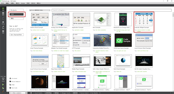 进入 Qt Creator 的欢迎模式,选择下图中的红框所选的示例程序运行,可以从示例程序中学习怎么进行GUI绘制界面的,并学习一些控件的使用,如下图所示。