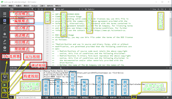 Qt Creator的高级代码编辑器支持编辑 C++ 和 QML (JavaScript)、上下文相关帮助、代码完成功能、本机代码转化及其他功能。