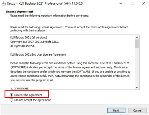 2、小编以64位为例,双击“klsbackup_pro_x64.exe”文件运行,勾选同意协议