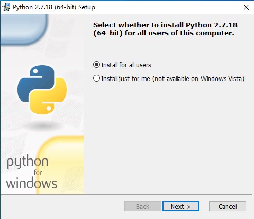 从本站下载安装文件,直接选择“python-2.7.18.amd64.msi”即可安装! 1、选择使用的对象。是所有使用电脑的人还是仅自己。点击“Next”