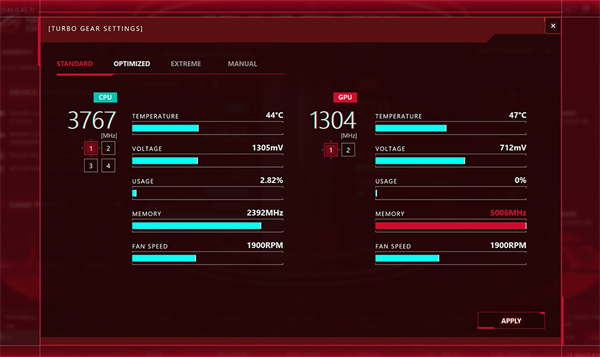 ROG Gaming Center可以通过用户友好的界面来监视CPU、内存、显卡等硬件组件的实时性能指标,以便用户了解设备的使用情况。此外,它还提供了一些实用的功能,例如快速启动游戏、游戏优化、调整系统设置等。通过ROG Gaming Center,用户可以轻松地访问设备的各种功能和设置,如风扇控制、键盘背光调节、声音配置等。它还可以提供一些额外的游戏增强功能,如网络优化和游戏录制。